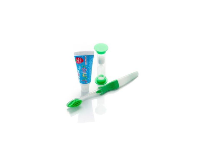 Compuesto por un cepillo de tamaño pequeño y con filamentos muy pequeños y suaves adaptados al tamaño de su dentadura (cepillo desprende una aroma a fresa que hace muy agradable el olor hacia los niños), una pasta dental junior con sabor a fresa y un reloj de arena.