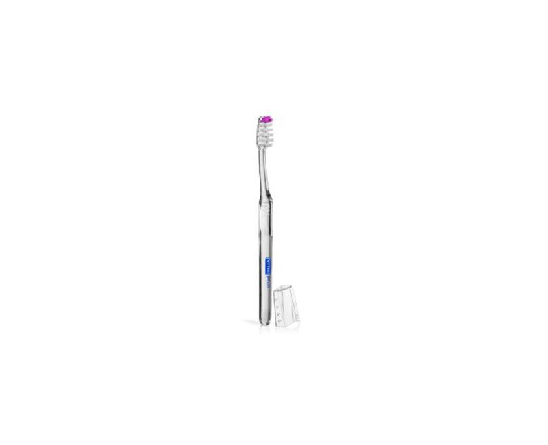 Cepillo de uso diario. Cabezal normal. Filamentos suaves, con penachos separados, perfil recto. Cuello maleable que permite su flexión hasta adquirir la posición del cepillo que mejor se adapta a la cavidad bucal, facilitando la accesibilidad durante el cepillado. Mango anatómico y con estrías antideslizamiento para facilitar su uso. Capuchón protector, mantiene los filamentos agrupados y en condiciones óptimas de higiene. 4 Colores: transparente, verde, azul y rojo.
